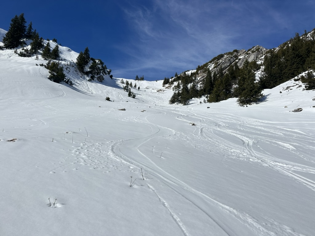 An diesem Donnerstag waren neben mir nur zwei weitere Tourengeher unterwegs. Nach kurzer Rast am flachen Gipfel ging es dann schon den tollen Osthang am Tenzeck durch super firn runter zur Krottentaler Alm, das bisher beste Stück der Tour.