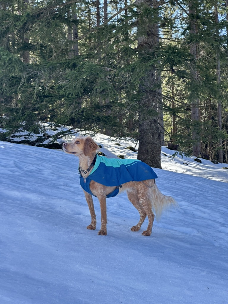 Die Spur zog sich auf teils schon sehr ausgeaperten Schneefeldern über kupiertes Gelände Richtung Tanzeck. Typisches Reibn-Gelände: kleine Mulden, kurze Steilstufen, dazwischen immer wieder flachere Passagen, wo Leika locker voraus trabte.